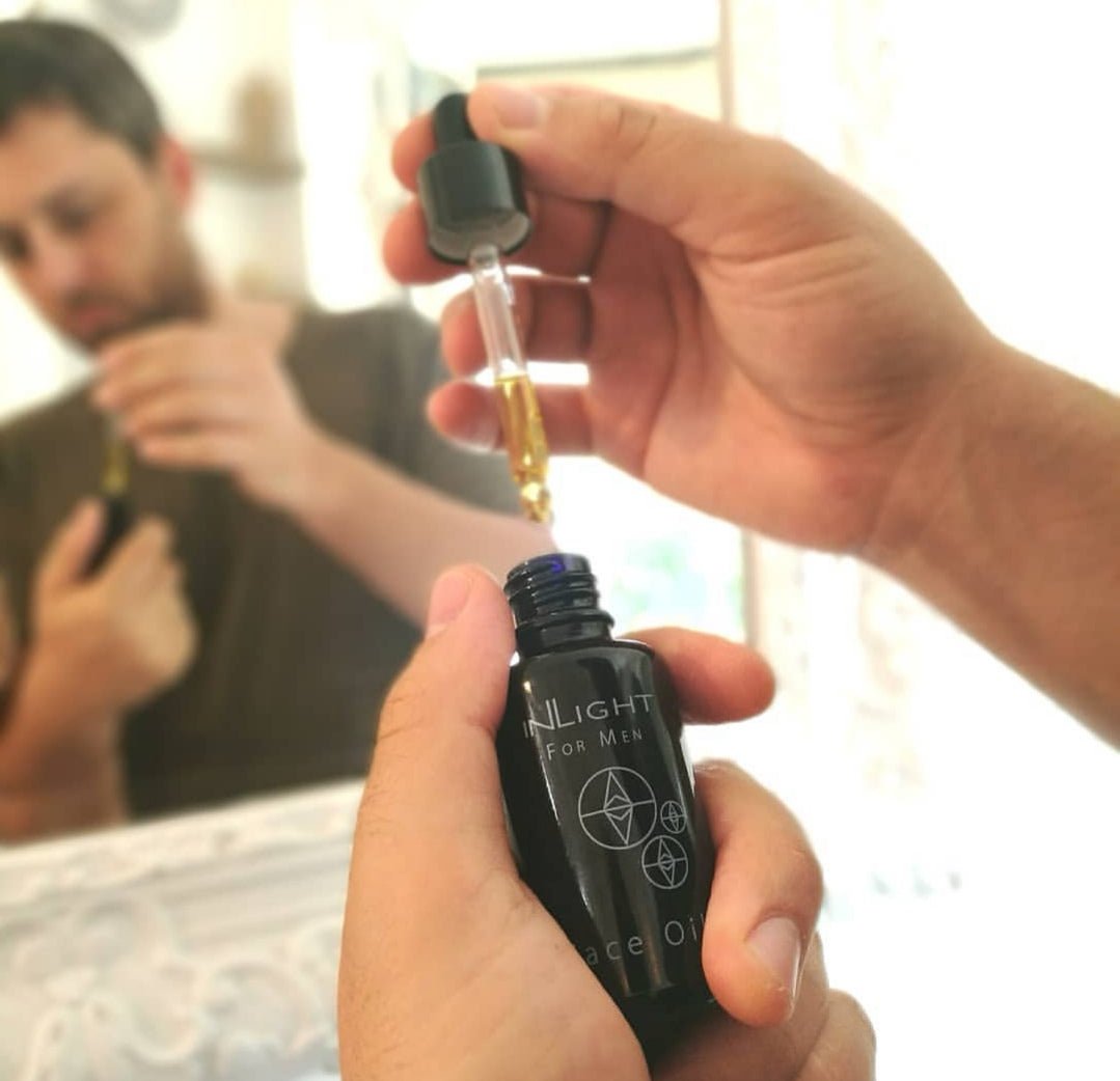 Inlight skincare can help men to achieve optimum results in preventing both skin inflammation and ageing, supplying the skin with many powerful botanical anti-inflammatory and natural anti-oxidants such as beta-carotene, Vitamin E and chlorophyll. Our skincare is designed for all skin types, but the Face Oil for Men was formulated especially for men’s skin and it smells rather good too, with invigorating patchouli and orange. The Essential Trio can be used for optimum results, replacing the Face Oil with Face Oil for Men if you prefer.